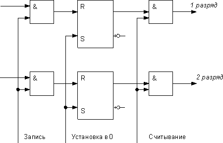 Регистр - схема для приема, хранения и передачи n-разрядного блока данных Они используются для промежуточного хранения, сдвига, преобразования и инверсии данных. Регистры выполняются на триггерах и логических элементах. Их число и тип определяются разрядностью слова и назначением регистра. Если регистр не требует предварительного сброса данных, (то есть установки всех его ячеек в ноль), то новые данные заменяют в нем старые. Схема регистра показана на рисунке 6.