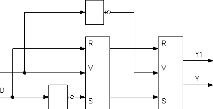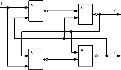 RS-триггер - двухвходовый триггер с раздельными входами для установки в 0 или 1 (рисунок 3.) При подачи единичного сигнала на вход R (-X0) триггер переходит в состояние 0 (Y=0, Y1=1), а при подачи на вход S (=X1) единичного сигнала -- в состояние 1 (Y=1, Y1=0). Одновременная подача единичного сигнала на оба входа запрещена. Обычно RS-триггеры бывают синхронизируемыми (вход для синхронизации - V).
