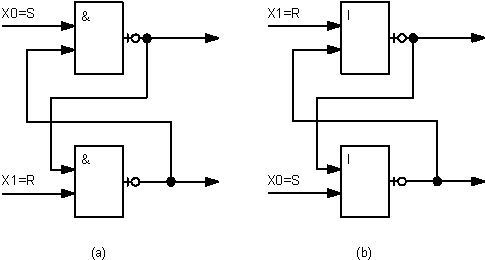 Рис. 2. Схема реализации триггера - защелки на элементах И-НЕ (a) и ИЛИ-НЕ (b).