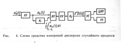Возможны различные варианты построения устройств для измерения дисперсии случайного процесса — дисперсиометров. На рис. 4 приведена структурная схема средства измерений дисперсии случайного процесса, т. е. работающего согласно выражению