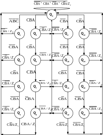 Чтобы не загромождать таблицу переходами в состояние Q0/Z2, условимся, что при всех остальных комбинациях Q и CBA, не описанных в таблице, переход будет осуществляться так: