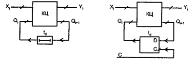 Принципиальным является деление АП на асинхронные и синхронные. В асинхронных (рис. 1, а) роль элементов памяти играют элементы задержки, через которые сигналы состояния передаются на входы КЦ, чтобы совместно с новым набором входных переменных определить следующую пару значений Y и Q на выходе. Элементы АП переключаются здесь под непосредственным воздействием изменений информационных сигналов. Скорость распространения процесса переключений в цепях асинхронного автомата определяется собственными задержками элементов.