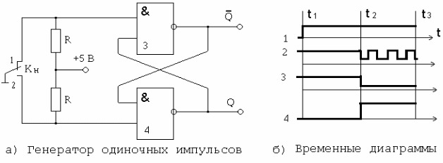 Для задания наборов аргументов логических функций используется генератор кодов, основой которого является пятиразрядный счётчик, построенный на Т - триггерах (из элементов 155-ой серии). На прямых выходах счётчика, выведённых на наборное поле передней панели стенда, можно получить 32 различные комбинации или 32 двоичных числа. Через соответствующие гнёзда каждый из пяти разрядов счётчиков может быть установлен в “1” или “0”. Кроме того, подключив вход счётчика (Сч) к выходу генератора одиночных импульсов (“0”-“1”), можно обеспечить последовательный перебор кодовых комбинаций: каждое нажатие кнопки (Кн) увеличивает число, записанное в счётчике, на единицу. Схема и временная диаграмма работы генератора одиночных импульсов, построенного на основе антидребезгового триггера, приведена на рисунке 4.