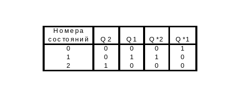 Из возможных состояний счетчика (00,01,10,11) исключаем, например, состояние Q1Q2. Порядок изменения состояний примем следующий