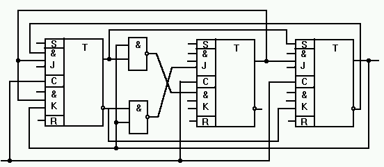 Рассмотрим пример построения синхронного счетчика с N=3 на JK триггерах 155 серии.