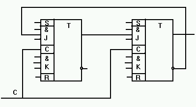 Таким образом, для построения недвоичного синхронного счетчика с Ксч=3 необходимо J - вход первого триггера соединить с инверсным выходом второго триггера, а J - вход последнего соединить с прямым выходом первого триггера. На К - входы обоих триггеров необходимо подать постоянный потенциал, соответствующий логической единице. Схема счетчика показана на рисунке 17.