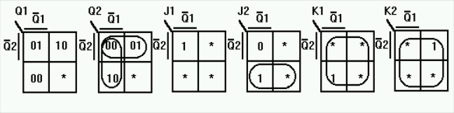 Преобразуем полученные таблицы Карно в соответствии с характеристической таблицей JK - триггера (таблица 1). Для этого в клетки прикладных таблиц запишем вместо двоичных чисел (00,01,10 и 11) значения информационных входов J и К, соответствующие определенным переходам Qi --- Q*i.