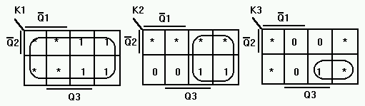 Так, например, для информационных входов Ji триггеров Q1,Q2,Q3 карты Карно будут выглядеть следующим образом, как показано на рисунке 8.