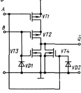 едостаток схемы - при подаче на входы A и В одновременно напряжений логических 1 схема потребляет ток от источника питания. Если же элемент И-НЕ выполнен на КМОП-транзисторах, то этого не происходит. В частности, на рис. 9, б дается схема подобного элемента. Транзисторы VT1 и VT2 имеют р-каналы, вследствие чего, когда на их затворах (входах A, В) действуют сигналы логических 0, они полностью открыты и на выходе Q имеется положительное напряжение логической 1. При этом транзисторы VT3 и VT4 полностью заперты, ибо имеют n-каналы. Когда на оба входа A, В одновременно действуют положительные напряжения логических 1, транзисторы VT1 и VT2 запираются и напряжение с выхода Q снимается. При этом транзисторы VT3 и VT4 отпираются и выход оказывается соединенным с общим проводом через малое сопротивление (500 - 1000 Ом). Если на одном из входов действует напряжение логического 0, а на другом - напряжение логической 1, то один из транзисторов с р - каналом (VT1 или VT2) запирается, но другой остается открытым, и поскольку они включены параллельно, на выходе остается напряжение логической 1. При этом один из транзисторов с n-каналом (VT3 или VT4) оказывается открытым; другой - закрытым, и, поскольку они включены последовательно, шунтирования выхода Q малым сопротивлением не происходит и напряжение на выходе оказывается высоким. Таким образом, сама схема тока не потребляет (разве что в те мгновения, когда происходит процесс ее переключения — но это, в среднем, доли микроватта). ТТЛ-вариант схемы логического элемента И-НЕ дан на рис. 5, в. Из рассмотрения рисунка вполне очевидно, что схема представляет собой стандартный элемент И (рис. 5, в), к которому добавлен выходной стандартный усилитель — от инвертора (см. рис. 7, б). Условные изображения логического элемента И-НЕ дана на рис. 9, г.