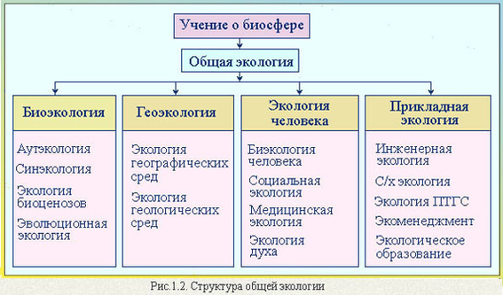 Это определение удерживает экологию в рамках биологических наук. В последующем, содержание понятия экологии многократно расширялось. Под ней стали понимать науку, изучающую среду обитания всех живых существ, включая человека. Казалось бы, уместно ограничить содержание экологии лишь природной средой. Однако, воздействуя на природную среду и изменяя ее, человек тем самым меняет условия существования не только растений и животных, но и самого себя, того общества, которое попадает под воздействие этого производства и природы, и созданных им изменений. Потому правомерно рассматривать всю окружающую человека среду. И не только природную, но также социальную и производственную, порой от природы основательно оторванную. Поскольку взаимодействие организмов между собой и окружающей их средой всегда системно, то есть всегда реализуется в форме некоторых систем взаимосвязей, поддерживающихся обменом вещества, энергии и информации, основным объектом исследования экологии являются экосистемы. Самой крупной в иерархии экосистем является биосфера. Учение о биосфере - это обширная область знания о функционировании и развитии биосферы, включающая в себя целый ряд научных направлений естественнонаучного и общественного профиля. Учение о биосфере в том числе включает в себя общую экологию, которая состоит из четырех основных разделов: биоэкологии, геоэкологии, экологии человека и прикладной экологии (рис.1.2).