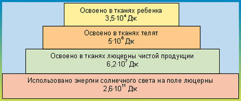 В соответствии с законом пирамиды энергий Р.Линдемана и правила десяти процентов, с каждой ступени на последующую ступень переходит приблизительно 10 % (от 7 до 17 %) энергии или вещества в энергетическом выражении (рис.7). Заметим, что на каждом последующем уровне при снижении количества энергии ее качество возрастает, т.е. способность совершать работу единицы биомассы животного в соответствующее число раз выше, чем такой же биомассы растений.