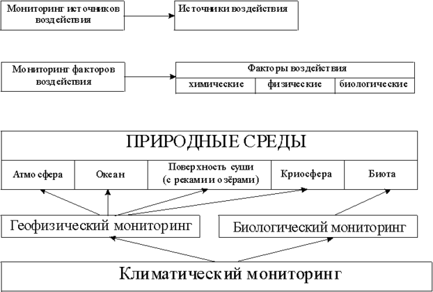 Наблюдения за состоянием окружающей природной среды должны включать наблюдения за источниками и факторами воздействия (в том числе источниками загрязнений, излучений и т.п.). За состоянием элементов биосферы (в том числе за откликами живых организмов на воздействие (см. рис. 3), за изменением их структурных и функциональных показателей). На рисунке также показана классификация мониторинга.