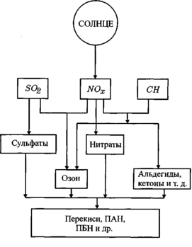 Фотохимический смог - это комплексная смесь, образующаяся при воздействии солнечного света из двух основных компонентов выбросов автомобильных двигателей - NO и углеводородных соединений. Другие вещества (SO2), твердые частицы также могут участвовать в смоге, но не являются основными носителями высокого уровня окислительной активности, характерной для смога. Стабильные метеорологические условия благоприятствуют развитию смога: