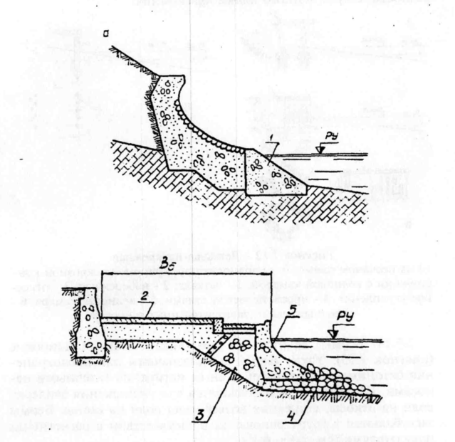 Рисунок 3 - Защитные прикрытия (бермы): а) узкая на скальном основании; 6) широкая; 1 - бетонный блок-берма; 2 - бетонная плита; 3 - рваный или булыжный камень; 4 - каменная постель; 5 - волноотбойный барьер
