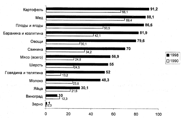 С начала 90-х годов XX века в России наблюдается бурный рост хозяйств населения - формы сельскохозяйственного производства, где продукция предназначена в основном для собственного потребления. К 1998 г. эта форма становится основной в сельском хозяйстве России: удельный вес хозяйств населения в общем объеме сельхозпроизводства достиг 57% (рис. 12).