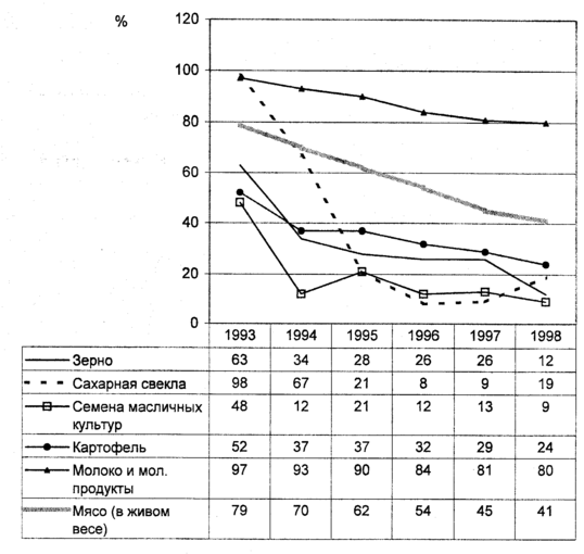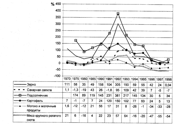 В России сельскохозяйственные предприятия чаще всего низкорентабельны. Резкий спад рентабельности производства основных видов сельскохозяйственной продукции в середине 90-х годов связано со снижением доли государственных закупок по фиксированным ценам и, соответственно, снижением прибыли (рис. 9 и 10). Следует участь также изношенность основных фондов и увеличение издержек на их поддержание. Пик рентабельности в начале 90-х годов следует, в первую очередь, объяснять резким ростом цен на продукты питания.