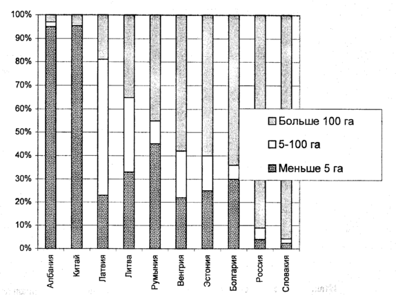 Это наиболее распространенная по площади занимаемых земель форма хозяйствования. По данным Е.В. Серовой, в 1994-1995 гг. хозяйства площадью более 100 га занимали в нашей стране 91% сельскохозяйственных угодий. Как видно на рис. 8, иллюстрирующем эти данные, среди постсоциалистических стран достаточно условно можно выделить 3 группы, различающиеся по способу ведения хозяйства. В первой из них, к которой относится Китай и Албания, преобладает мелкоземельное натуральное хозяйство. Во второй, наиболее многочисленной группе стран Восточной Европы, в той или иной степени распространены все формы землепользования. Наконец, к третьей группе относятся Россия и Словакия, где почти все сельскохозяйственные земли занимают различные коллективные хозяйства.