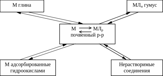 На рисунке Лр – растворимые лиганды, какими являются органические кислоты с малым молекулярным весом, а Лн – нерастворимые. Реакция металлов (М) с гумусовыми веществами включает частично и ионный обмен.