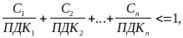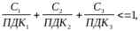 При совместном присутствии в воздухе нескольких веществ, обладающих суммацией действия, сумма их концентраций не должна превышать 1(еденицы) при расчете по формуле: