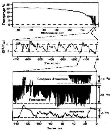 изменение температуры, оценённое по изменению изотопного состава льда в Гренландии и Антарктиде, и оценённое по изменению изотопного состава льда в Гренландии и Антарктиде, и оценённое по органическим осадкам на Севере Атлантического океана [1].