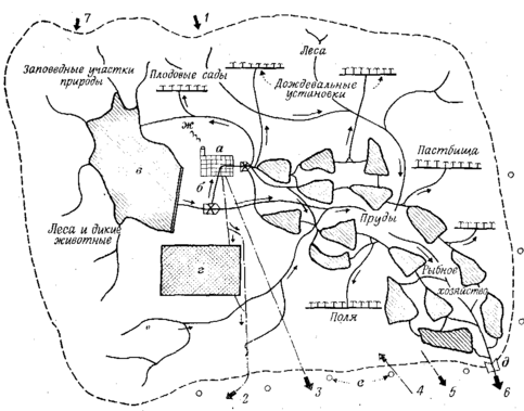 Фиг. 219. Схема зоны обработки отходов для будущей атомной электростанции (а), расположенной в естественном водосборном бассейне (очерчен пунктиром). Тепловые отходы (т. с. тепловое загрязнение) — вода, используемая для охлаждения реактора (б), вытекают из большого накопительного бассейна в и полностью рассеиваются, испаряясь из сети мелких прудов н систем дождевальных установок. Теплые пруды можно использовать для разведения рыбы, спортивного рыболовства и других видов отдыха и развлечений. Орошение наземных участков водосборного бассейна повышает урожай полезных лесных и сельскохозяйственных продуктов; в то же время пода, пройдя через наземные «живые фильтры», вновь стекает в реки, пруды и попадает в грунт. Слабоактивные и твердые отходы захороняются на специальных участках (г). Высокоактивные отходы отработанного ядерного горючего вывозятся в специальные места захоронения радиоактивных отходов, расположенные вне данной зоны. Состав речных и грунтовых вод и газов из дымовых труб непрерывно регистрируется у плотин id], в специальных скважинах (е) и при помощи специальных установок в трубах. Благодаря такому контролю не допускается утечка загрязнений из зоны. Эта система имеет следующие основные входы и выходы (пронумерованные стрелки по краям схемы): / — поступление солнечного света и атмосферных осадков; 2 — выход радиоактивных отходов в захоронения; 3 — электроэнергия в города и т. п.; 4 — вход ядерного и прочего горючего; 5 — выход пищевых продуктов, волокна, чистого воздуха и т. п.; 6 ~ сток чистой воды для сельского хозяйства, промышленности и городов; 7 — использование для отдыха, а также для обучения и научных исследований. Площадь такой зоны обработки отходов' зависит от климата и рельефа местности, а также от электрических и других силовых установок, требующих охлаждения. Минимальная площадь, необходимая для 100%-ной переработки отходов (загрязнений), с учетом возможных аварий И механических поломок составит 400 га на электростанцию мощностью 2500 МВт. В зоне обработки отходов такой емкости можно было бы разместить также предприятия легкой промышленности. Предприятия тяжелой промышленности следует размещать в пределах собственной зоны обработки отходов.