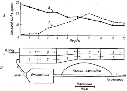 Сточные воды пускают через ряд соединяющихся бассейнов и прудов (Б). На графике (-4) показано образование (Р) и расходование (R) кислорода в каждом пруду. Видно, что «самопроектирующиеся» естественные сообщества прудов разлагают органическое вещество, и, когда вода доходит до 10-го пруда, откуда она сбрасывается в реку, соотношение между Р и К вполне хорошее.