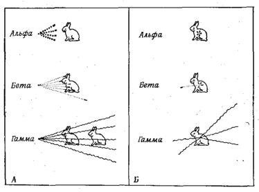 Показана относительная проникающая способность и специфический ионизационный эффект. Это чисто качественная схема, совершенно не отражающая количественных соотношений. А. Источник излучения снаружи. Б. Источник излучения внутри.