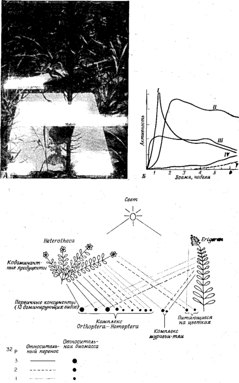 А. Введение метки в отдельное растение при помощи небольшого прокола на стебле. Б. Поглощение метки на разных трофических уровнях. / ~-питающиеся нектаром; // — травоядные; /// — растения; IV — детритофаги; V — хищники. В. Схема сети питания, состоящей из дпул доминирующих БИДОН растений и потребляющих их травоядных. Дальнейшие объяснения — в. тексте.