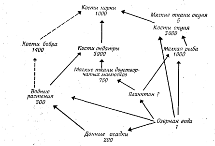 Фиг. 226. Накопление стронцня-90 в разных частях сети питания одного небольшого канадского озера, получающего низкоактивпые отходы. Цифры, указывают средние коэффициенты накопления относительно озерной воды, коэффициент накопления которой принят за единицу.