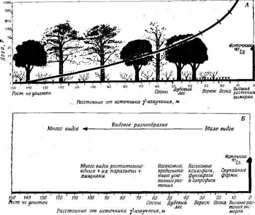 В общем вдоль градиента облучения можно выделить 5 зон: 1) центральная зона, в которой ни одно ,из высших растений не выживает; 2) зона осоки; 3} зона черники и паслена; 4) угнетенный дубовый лес и 5) интактный дубово-сосновый лес, в котором заметно некоторое угнетение роста, но нет погибших растений.