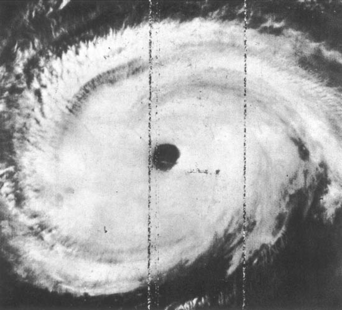 В центре каждого тропического циклона образуется область очень низкого давления с высокой температурой. Это и есть « глаз тайфуна». Его диаметр составляет 10 - 30 км. Здесь тихо, а вокруг, вращаясь по часовой стрелки, бушуют ураганные ветры. «Глаз тайфуна», или