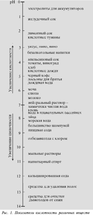Например, если в растворе концентрация водородных ионов равна 10–5 моль/л, то показатель кислотности этого раствора рН = 5. При этом изменению показателя кислотности рН на единицу соответствует десятикратное изменение концентрации водородных ионов в растворе. Так, концентрация водородных ионов в среде с рН = 2 в 10, 100 и 1000 раз выше, чем в среде с рН = 3, 4 и 5 соответственно.