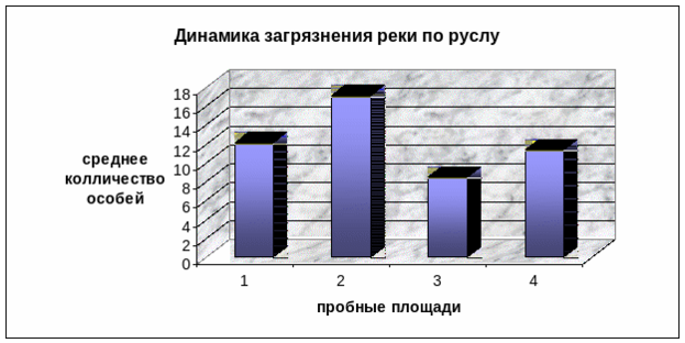 То, что касается непосредственно самой реки Херота, то из рисунка 4.1 четко видно, что динамика загрязнения реки по руслу обусловлена большой концентрацией антропогенных объектов в районе средней части реки. Большее количество загрязнения попадает в реку именно здесь, и поэтому количество дафний в пробах, отобранных на третей пробной площади минимально. Улучшение ситуации, хотя и не сильное, на четвертой пробной площади связано с природным ассимиляционным потенциалом территории, но видно, что он не настолько высок, чтобы справиться со всем количеством загрязнителей(рис.4.1).