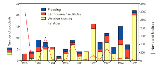 Начиная с конца 80-х годов нашего столетия стихийные бедствия приобрели больший масштаб. Экономический урон, нанесенный природными наводнениями и оползнями, произошедшими за период 1990-1996 год, превысил суммарный ущерб за всё предыдущее десятилетие.