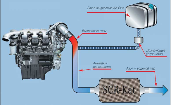 Селективный преобразователь состоит из двух основных узлов: непосредственно каталитического нейтрализатора с сотовой структу­рой, вмонтированного в глушитель автомобиля, и дополнительного бака под аммиачный заменитель AdBlue. Так что установка системы SCR на автомобили с моторами Евро 3 не потребует кардинального из­менения их конструкции.