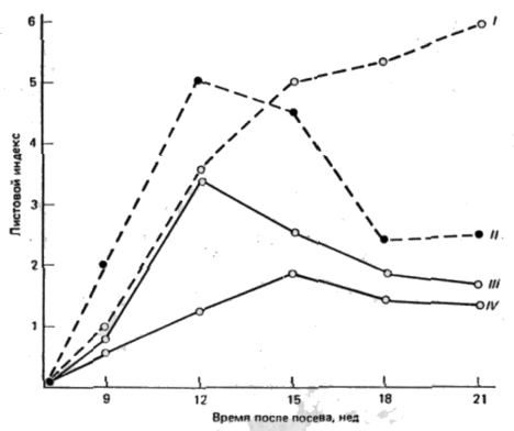 Рис. 1. Сосуществование видов клевера (Trifolium). На графике показан рост популяций двух видов в чистых (т, е. представленных только одним видом) и смешанных травостоях. Следует отметить, что внимание на то, что кривые роста двух видов в чистых травостоях различны и в разное время достигают зрелости. Это и другие различия позволяют видам сосуществовать в смешанных травостоях, но при этом их плотность понижена, так как они в одинаковой степени мешают друг другу. Листовой индекс, который используется для оценки плотности биомассы, представляет собой отношение площади поверхности листьев к поверхности почвы (см2/ см2). I –T.fragiferum, чистый травостой; II - Т. repens, чистый травостой; III - T. repens, смешанный травостой; IV—T. fragiferum, смешанный травостой.