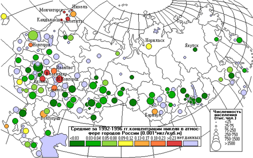 Никель поступает в атмосферу от предприятий цветной металлургии, на долю которых приходится 97% всех выбросов никеля, из них 89% на долю предприятий концерна “Норильский никель”, расположенных в Заполярном и Никеле, Мончегорске и Норильске.