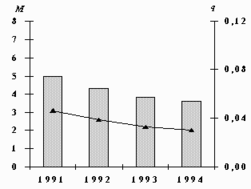 Выбросы М (тыс.т/год) и среднегодовые концентрации q (мкг/м3) свинца.