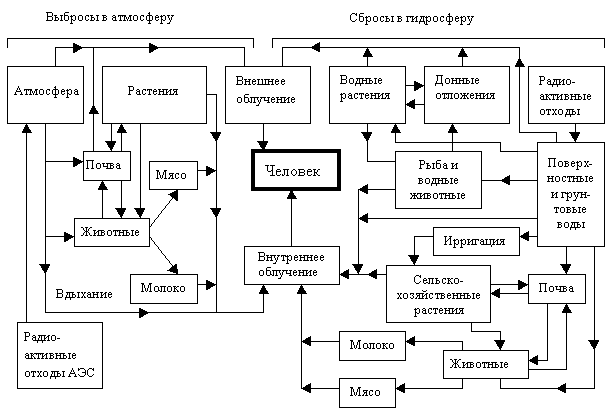 Схема путей воздействия радионуклидов на организм человека.