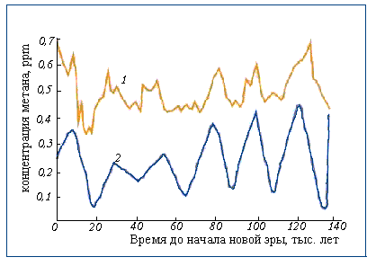 Изменение концентрации метана в атмосфере Земли за последние 140 тыс. лет представлены на рис. 1. Кривая осадков характеризует оледенения: мало осадков - оледенение, много осадков - потепление. Из рис. 1 видно, что во время оледенений концентрация метана падала и иногда достигала рекордно низких значений (например, 0, 35 ppm). Важно отметить, что концентрация метана до новой эры никогда не превышала 0, 7 ppm. Естественно, что до новой эры интенсивность хозяйственной деятельности человечества была незначительной и поэтому наблюдаемая концентрация метана обеспечивалась только естественными факторами.