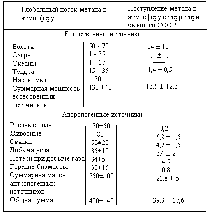Аналогичный механизм образования метана наблюдается и при горении биомассы. Основной источник метана, выделяющегося при горении биомассы, находится в Африке, где широко практикуется сжигание соломы при подготовке почвы для нового урожая. Использование дерева для приготовления пищи и отопления дает незначительный вклад. Величины потоков метана приведены в табл. 1. Видно, что страны бывшего СССР производят около 5—15% от общего потока метана в атмосферу. В качестве источника не включены насекомые, так как количество термитов на территории бывшего СССР было крайне незначительным. Гидраты метана также не включены, так как оценка запасов гидратов метана в мире и странах бывшего СССР пока очень приблизительна. Следует отметить, что и оценка потока метана от гидратов метана приводит пока к незначительной величине.