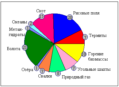 Метан попадает в атмосферу как из естественных, так и из антропогенных источников. Мощность антропогенных источников в настоящее время существенно превышает мощность естественных. К естественным источникам метана относятся болота, тундра, водоемы, насекомые (главным образом термиты), метангидраты, геохимические процессы. К антропогенным - рисовые поля, шахты, животные, потери при добыче газа и нефти, горение биомассы, свалки. Мощность этих источников приведена в табл. 1. Относительное распределение источников по их мощности дано на рис. 3.