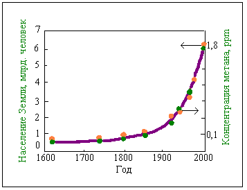 Рис. 2. Изменения содержания метана в атмосфере и населения Земли во времени33