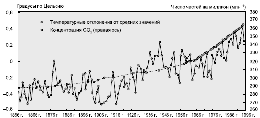 Хотя по вопросу о причинах возникновения этого нового тренда глобального потепления среди ученых нет полного единогласия, все же большинство из них считают, что такое потепление непосредственно связано с увеличением поступления в земную атмосферу парниковых газов, в первую очередь СО2, которое происходит в результате увеличения объемов сжигаемого ископаемого топлива. Подтверждением того, что между этими двумя процессами существует прямая корреляция, может служить рисунок 170.