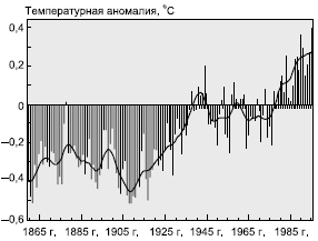 Однако наибольший интерес представляет рассмотрение климатических оптимумов и минимумов, имевших место на протяжении примерно полутора последних столетий – в период, когда велись уже систематические наблюдения за глобальной температурой воздуха. По данным Всемирной метеорологической организации (ВМО), эти изменения также оказались довольно значительными. Анализ рисунка 2 позволяет сделать вывод о том, что вся вторая половина XIX в. и начало XX в. оказались относительно более холодными. Затем началось постепенное потепление, достигшее своего максимума в 1930—1940-е гг. Это потепление коснулось всех природных зон, вызвав повышение средней температуры, увеличение облачности и осадков, повсеместное отступление горных ледников. Но особенно сильным это потепление было в высоких (северных) широтах – в Арктическом бассейне, в Канаде, на Аляске, в Гренландии, на российском Севере. В российском секторе Арктики площадь морских льдов сократилась наполовину, что улучшило условия навигации по Северному морскому пути. К северу сместилась зона вечной мерзлоты, изменились ареалы распространения флоры и фауны.