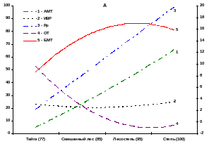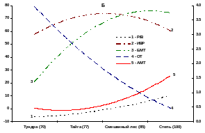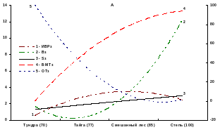 Рис. 2. Экологическая характеристика биоценозов озер различных природно-климатических зон (полиномиальные тренды): А - зоопланктоценоз: по левой оси ординат - биомасса (Вз), г/м3, индекс видового разнообразия (ИВРз), индекс сапробности (Sз); по правой оси ординат - биомасса олиготоксобов и в-мезотоксобов (ОТз и БМТз, %). Б - ихтиоценоз: по левой оси ординат - ихтиомасса олиготоксобов, в- и б-мезотоксобов (ОТ, БМТ и АМТ, %); по правой оси ординат - ИВР и Р/В коэффициент. По оси абсцисс - природная зона (суммарная радиация, ккал/см2)