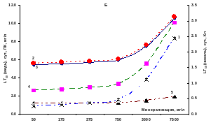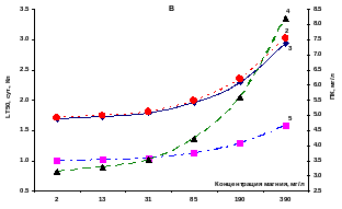 Парный регрессионный анализ позволил получить целый ряд уравнений зависимости токсикометрических параметров реагентов от исследованных параметров водной среды (р ≤ 0.05). На примере металлов мы рассчитали их токсичность при разных уровнях гидрохимических показателей и содержания хлорофилла, соответствующих средним значениям различных типов и классов озер (рис.1). При увеличении значений фоновых характеристик водной среды закономерно повышаются все токсикометрические параметры меди и никеля, т. е их токсичность при остром и хроническом воздействии (по LT50 и ПК) для гаммарид Южного Урала снижается. Увеличение Кп также указывает на понижение токсичности металлов по мере возрастания фоновых показателей. В регионе ВКО выявлены аналогичные закономерности. Приведенные данные свидетельствуют о существенной статистически и биологически значимой зависимости токсичности металлов от трофического статуса водоемов и всего комплекса исследованных гидрохимических показателей.