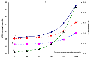 В экспериментах на D. magna изучено влияние гидрохимического класса вод на ПК реагентов. Модельную фоновую среду создавали добавлением гидрокарбоната, сульфата и хлорида натрия к воде из Урозера до общей минерализации 200 мг/л. Полученные результаты указывают на существенную зависимости токсичности веществ различной природы от анионного состава среды, причем, эта зависимость неодинакова для изученных реагентов (табл. 1). Следовательно, при разработке токсикологических нормативов целесообразно учитывать химический класс вод.