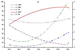 Рис. 3. Тренды связи параметров ихтиоценоза водохранилищ различных природных зон с суммарной радиацией (А) и географической широтой (Б): А: по оси абсцисс - природная зона (суммарная радиация, ккал/см2); по левой оси ординат - ихтиомасса олиготоксобов и в-мезотоксобов (ОТ и БМТ), %; по правой оси ординат - рыбопродукция (Рр), кг/га, ИВР, ихтиомасса б-мезотоксобов (АМТ), %. Б: по оси абсцисс - широта, град. с. ш.; по левой оси ординат - рыбопродукция (Рр), кг/га, ихтиомасса ОТ и БМТ, %; по правой оси ординат - ИВР, ихтиомасса АМТ, %