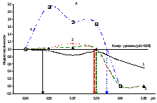 Рис. 7. Динамика популяционной ацидорезистентности Scenedesmus quadricauda (А) и Daphnia pulex (Б) при хроническом закислении водной среды: экспозиция – А: 1 – 5-е сутки, 2 – 10-е сутки, 3 – 15-е сутки, 4 – 20-е сутки опыта; Б: 1 – 14-е сутки, 2 – 28-е сутки опыта. Стрелками указано начало угнетающего воздействия рН